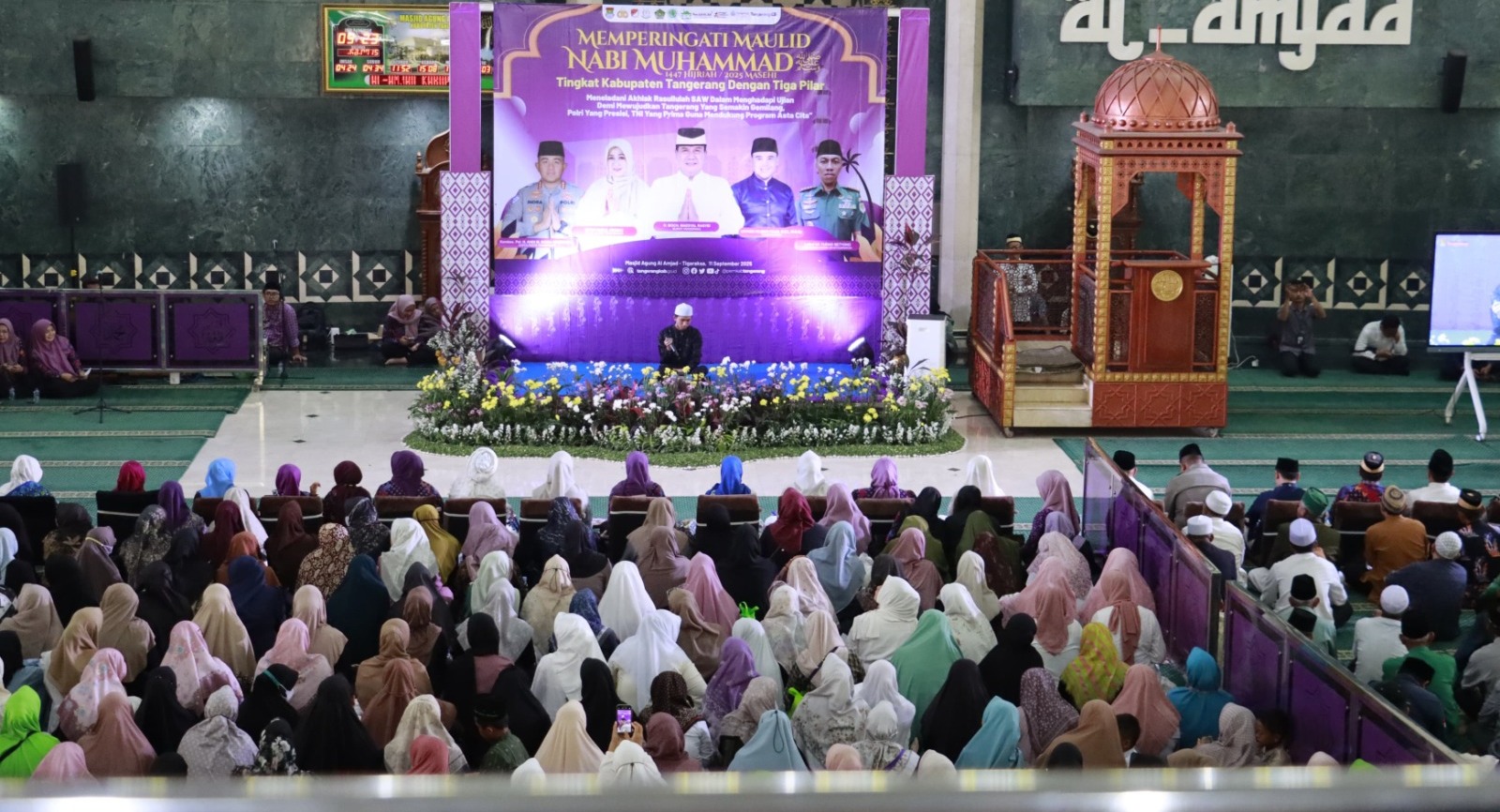 Ribuan masyarakat antusias menghadiri Peringatan Maulid Nabi Muhammad SAW di Kabupaten Tangerang di Masjid Agung Al-Amjad, Kabupaten Tangerang, Kamis (11/9/2025).