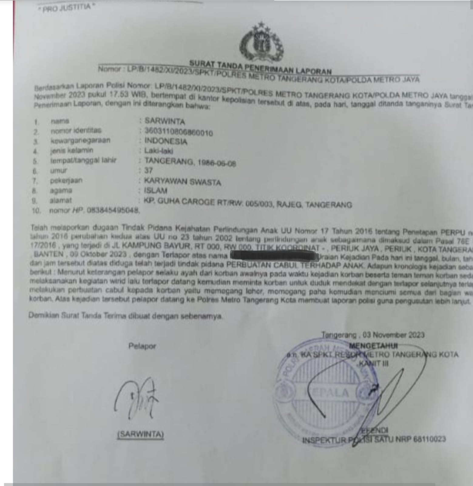 Dengan adanya perbuatan pencabulan oleh Sdra M.H., selaku pengasuh dan pemilik Ponpes di Kp Bayur, terhadap salah satu santri wanita anak dari Sdra Sarwinta (37th) selaku ayah korban pun langsung membuat laporan resmi ke Polres Metro Tangerang Kota pada tanggal 03/11/2023 dengan bukti Surat tanda penerimaan laporan (STPL) Nomor ; LP/B/1482/IX/2023/SPKT Polres Metro Tangerang Kota.