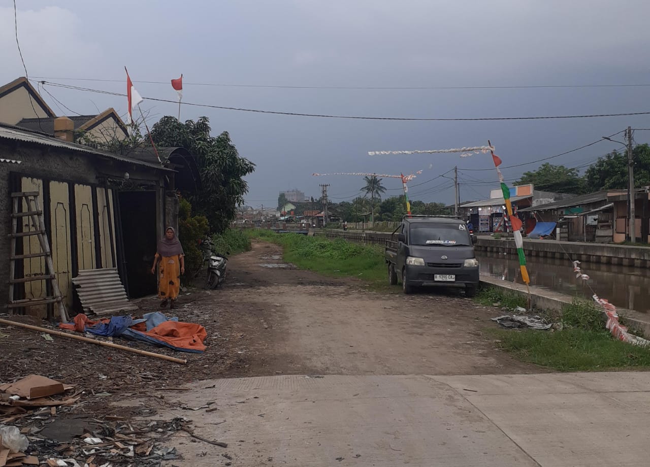 Program pekerjaan Exs Bupati Jaki, tentang pembangunan jalan irigasi Desa Pondok Jaya, Kecamatan Sepatan, Kab. Tangerang, Banten  belum tuntas, jumat, (22/08).